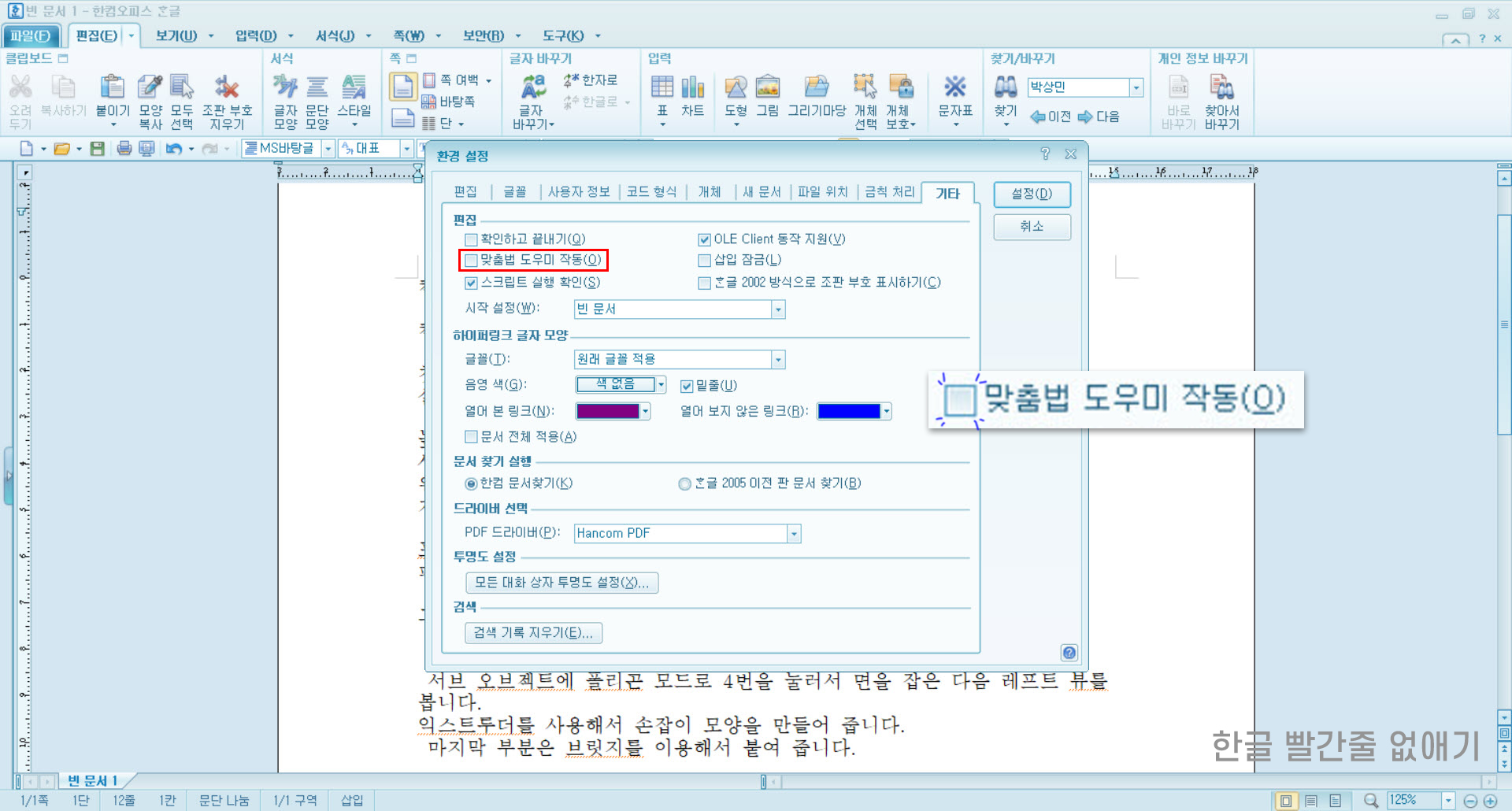한글 빨간줄 없애기