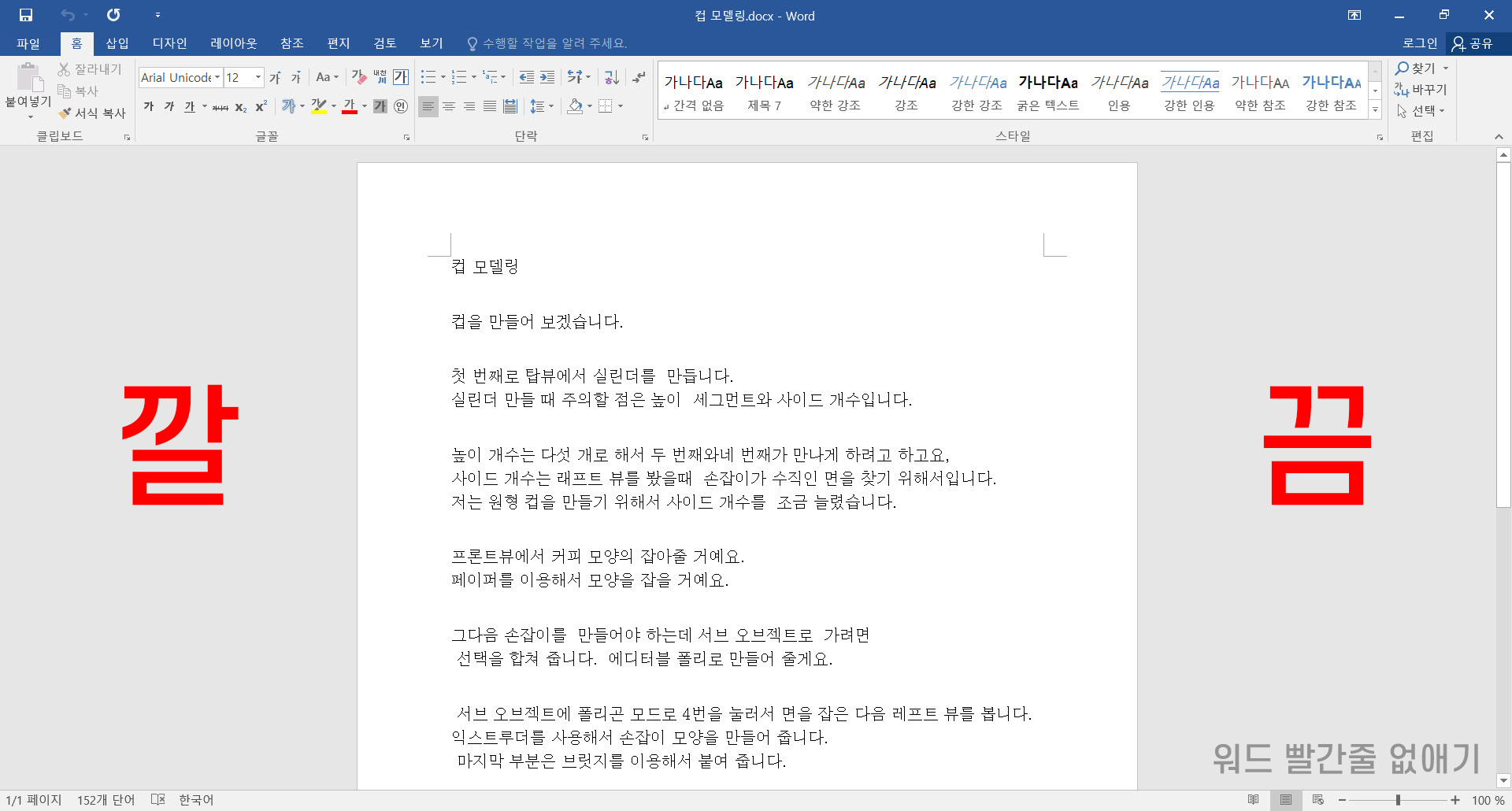 예를 들어 설명해드리기 위해 제가 작성중이었던 컵모델링 워드 문서를 열어보았습니다. 맞춤법이나 띄어쓰기를 체크해주는 빨간줄이 좋을 때도 있지만 아닌데도 굳이 빨간줄이 계속 나타날 때가 있기 때문에 워드 빨간줄 없애기 방법을 알고 게시면 작업에 매우 좋습니다. 우선 좌측 상단의 파일을 눌러주세요. (단축키 : Ctrl+O)