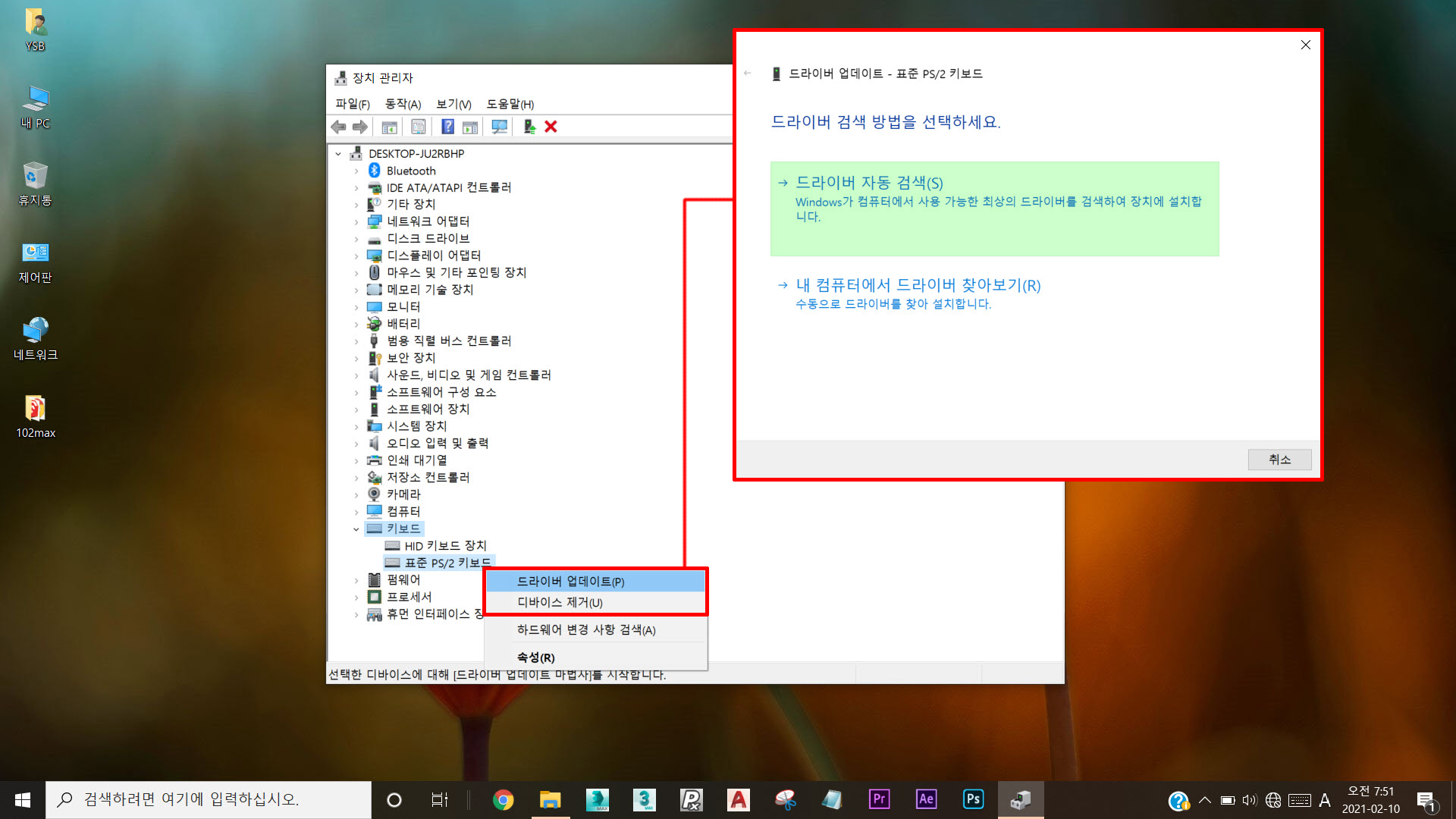 드라이버 업데이트를 누른 다음 드라이버 자동검색을 클릭하여 업데이트를 실행합니다.