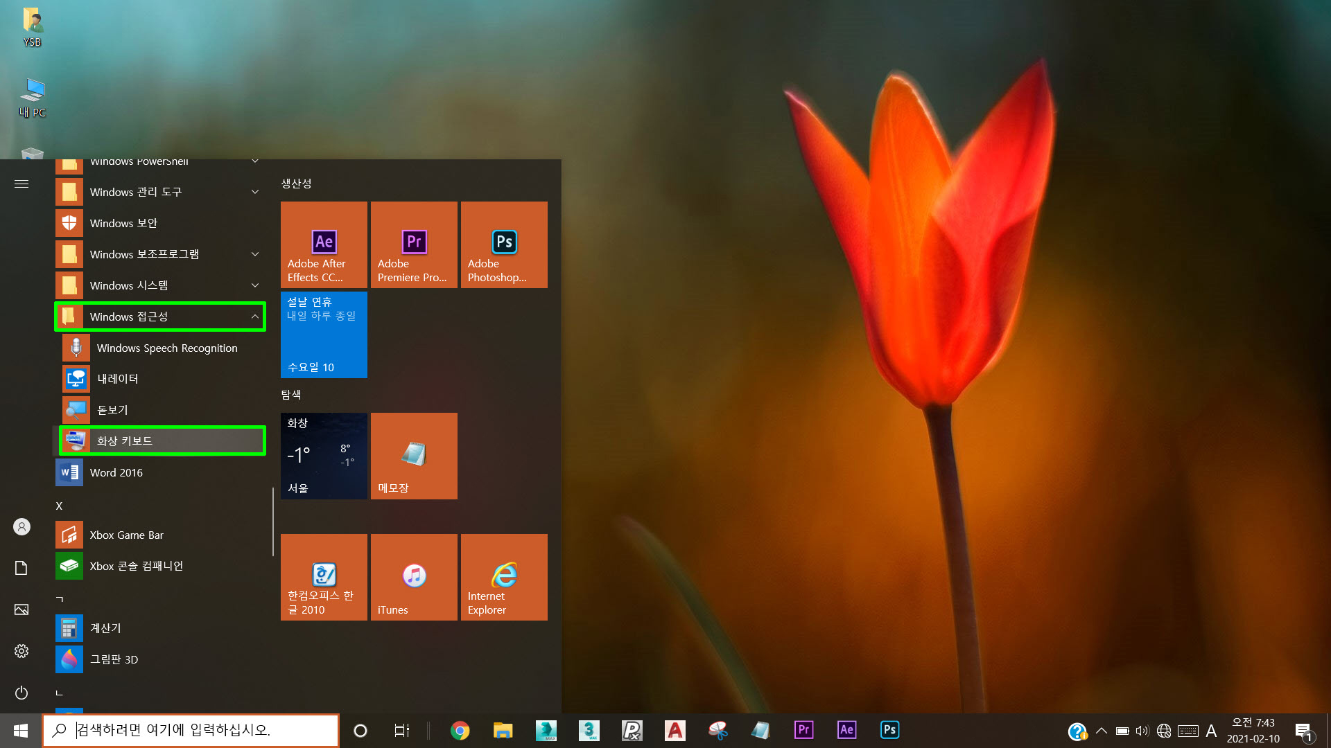 좌측 하단 윈도우키를 누르고 스크롤을 거의 끝까지 내리다보면 Windows 접근성 폴더가 보입니다.