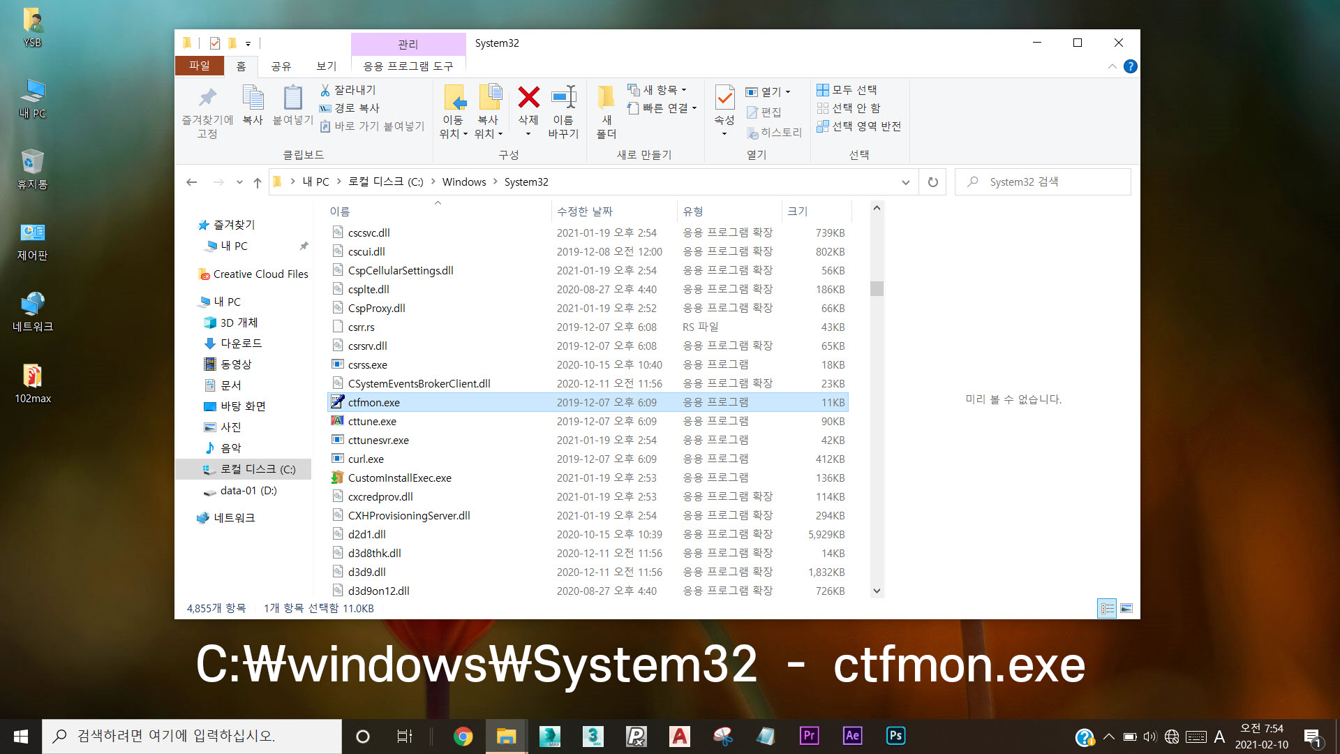 폴더를 열어서 C:\windows\System32 으로 진입한 다음 "ctfmon.exe" 파일을 찾아 실행(더블 클릭) 합니다.