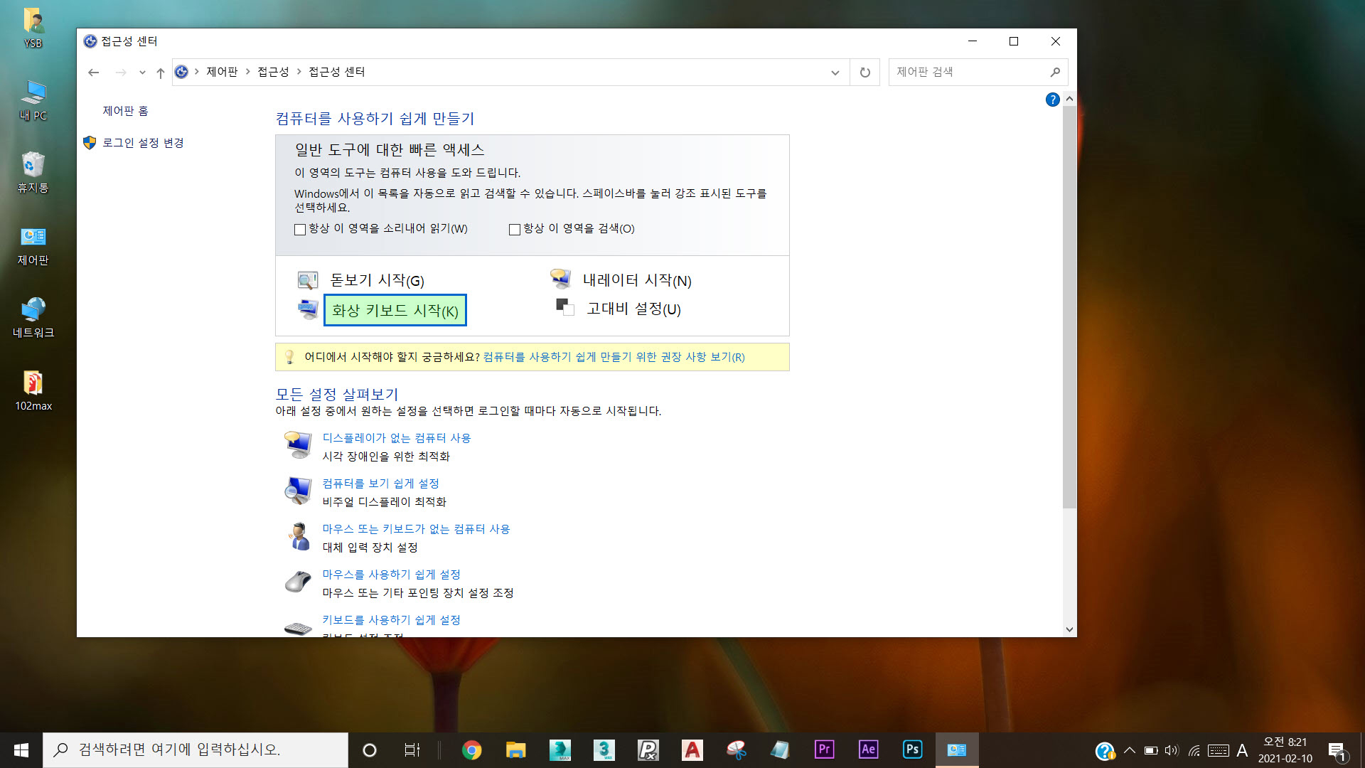 컴퓨터를 사용하기 쉽게 만들기 창 안에 화상키보드 시작(K)을 클릭하면 실행됩니다. 참고하시면 좋을 것 같습니다.