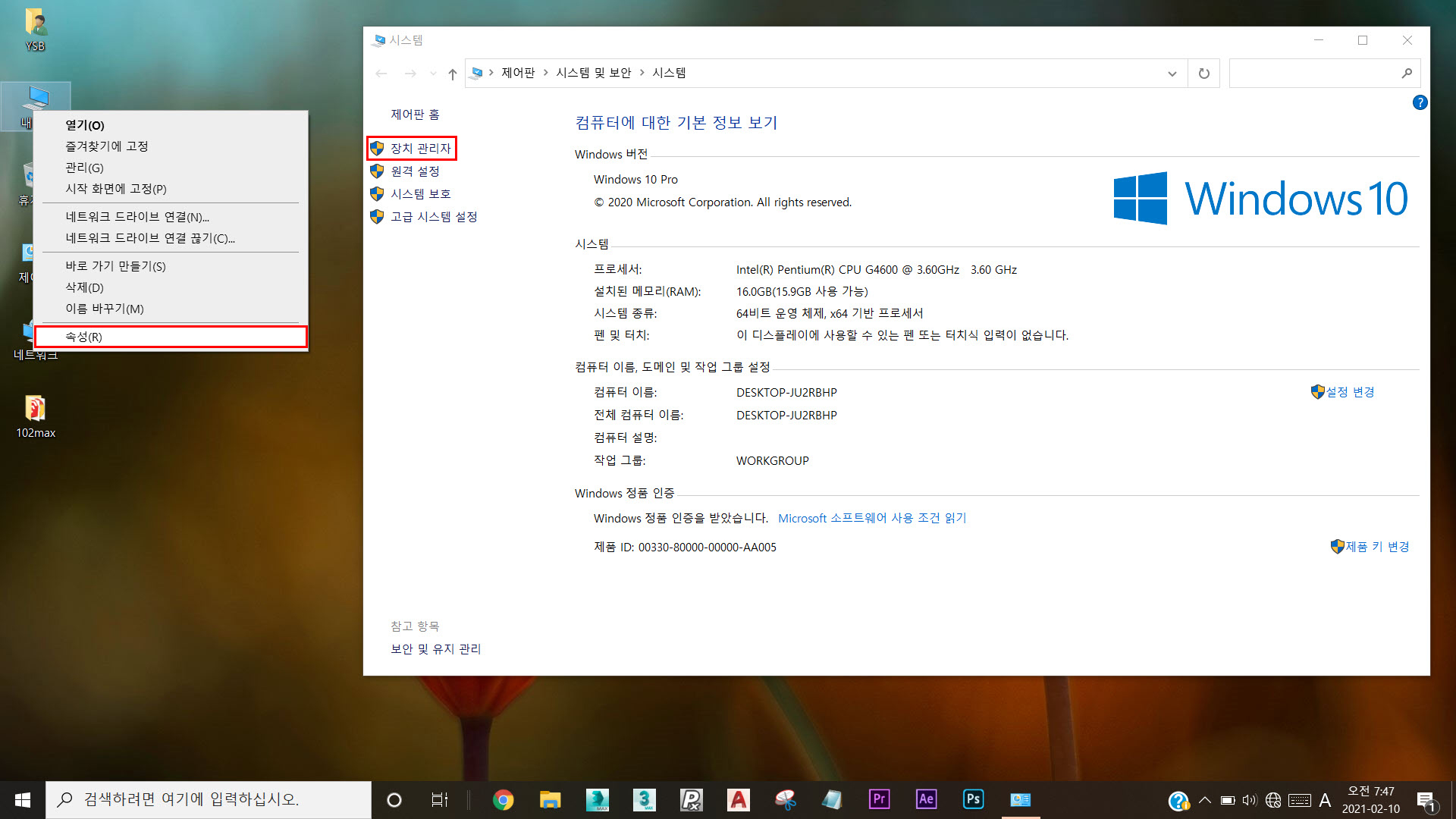 장치관리자로 진입하는 또 다른 방법은 컴퓨터 오른쪽 마우스 클릭, 속성을 선택하면 시스템에서 찾을 수 있습니다.