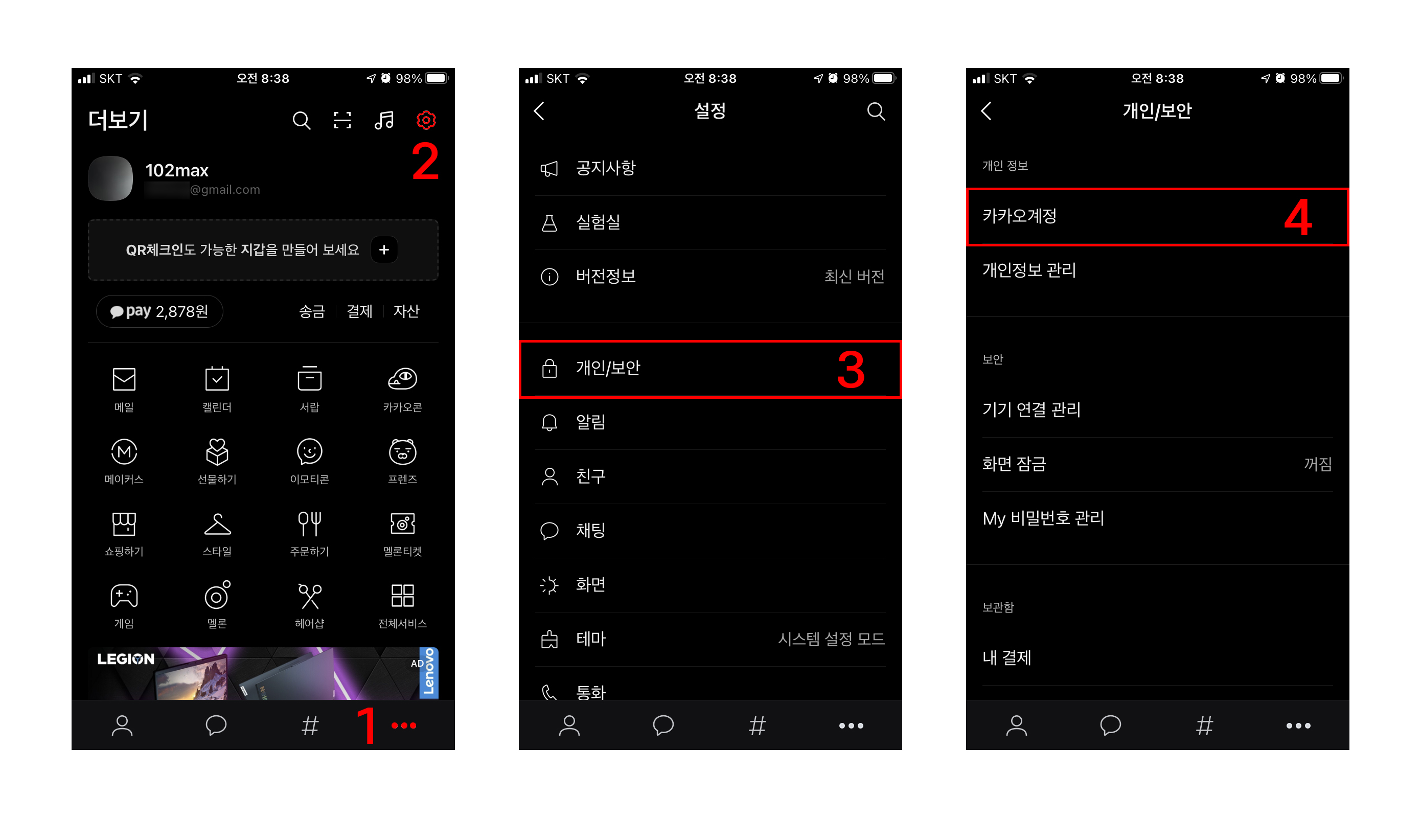 점3개 - 설정 - 개인/보안 - 카카오 계정