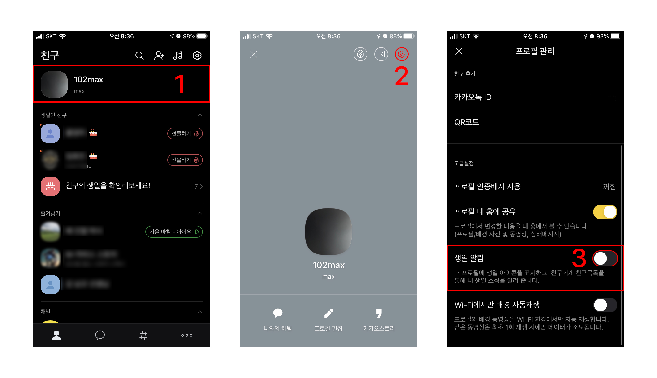 PC에서는 친구 생일 보기, 숨기기 기능만 가능합니다. 위 이미지 넘버링만 따라하시면 됩니다.