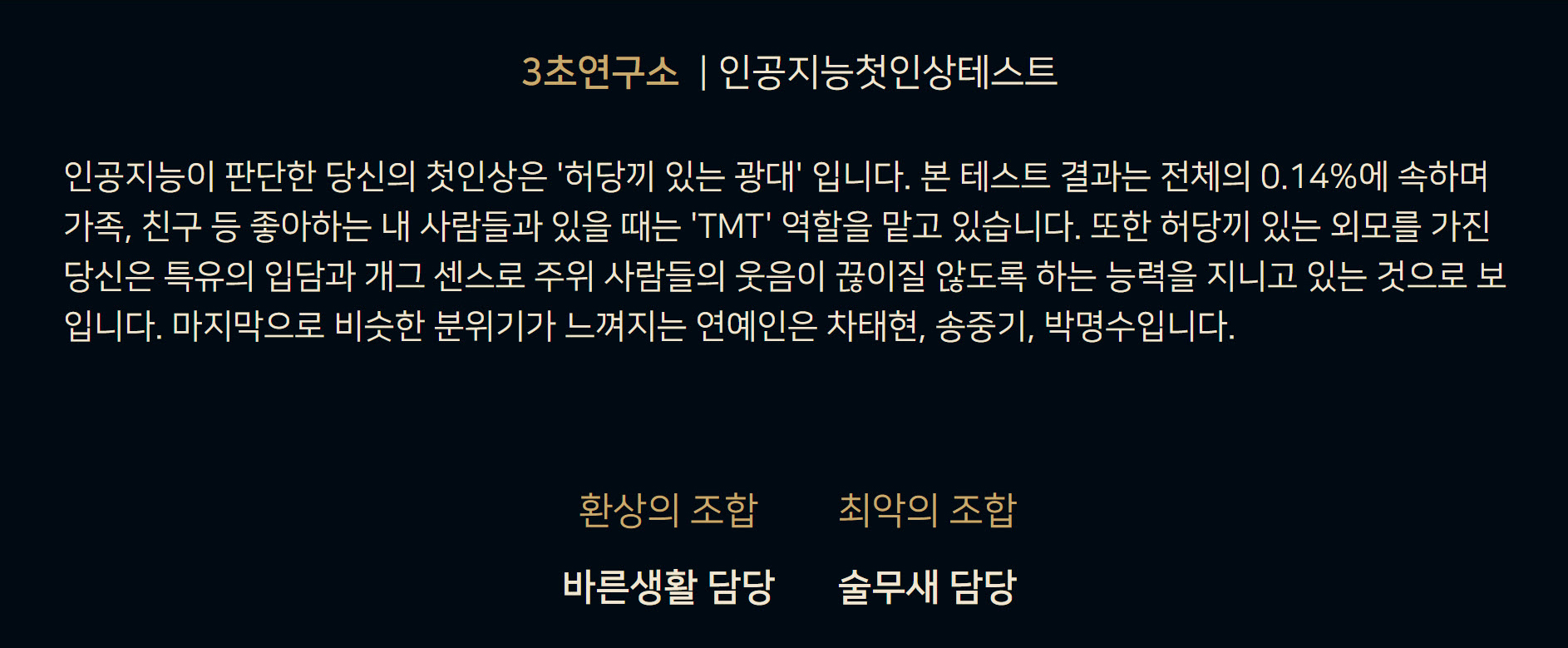 여러분도 3초 연구소에서 인공지능 첫인상 테스트와 오행 궁합 테스트 한번 받아보시고, 연인이나 짝사랑하는 이성이 있다면 연인 궁합 테스트도 한번 받아보시면 좋을 것 같습니다. :)