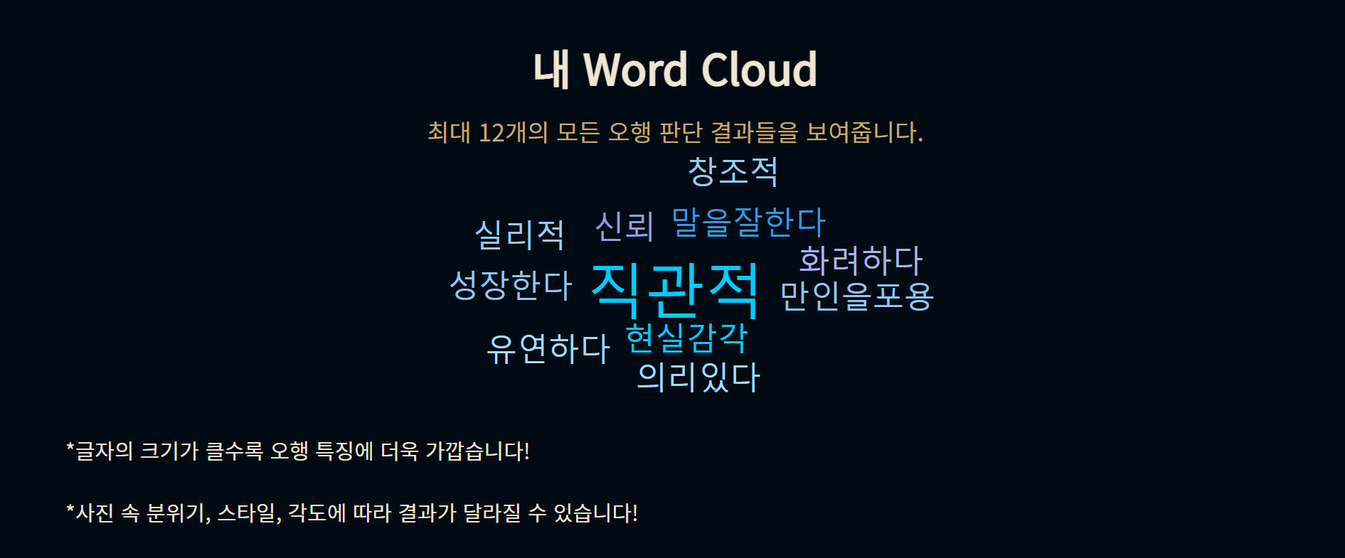 저에 대한 첫인상 판단 결과들을 보여주는데요, 글자의 크기가 클 수록 첫인상에 더욱 가깝다고 합니다. 저는 재밌다 글씨가 가장 크니까 재밌는 사람이 저의 첫인상이겠네요. 하지만 무표정이나 화난 표정으로 테스트한다면 달라지겠지요?