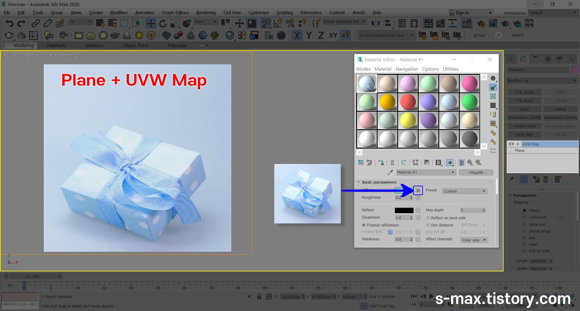 Plane을 하나 그리고 첨부한 이미지를 재질에 적용하여 UVW Map을 줍니다.